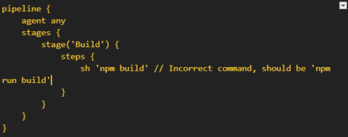 In a Jenkins pipeline, a small syntax error can prevent the job from executing correctly: